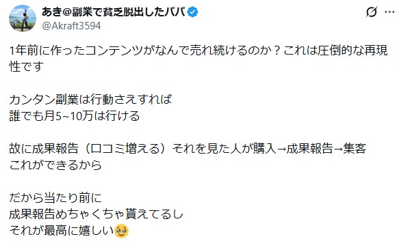 もちろんスペシャル特典渡してるので活用しまくってください✨ pic.twitter.com/TqIkWOqKjy— あき@副業で貧乏脱出したパパ (@Akraft3594) March 6, 2026